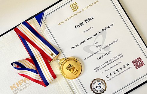 SIIF is the largest annual invention fair in the world, and this year it attracted more than 600 inventors from 27 countries. Presenting CONC+PLUS at SIIF 2021 brought extra challenges. Amin participated remotely due to COVID-19 concerns. Not only did he need to explain his bio-concrete to a panel of judges with mixed backgrounds, he had to do it over a video call from 6,000 years away.