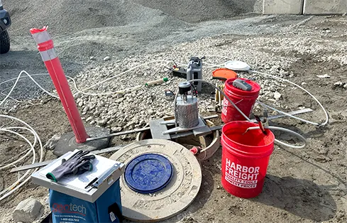 After drilling, it’s time to ensure our monitoring wells are in pristine condition. Well development is the process of clearing out any silt or fine particles introduced during drilling, as well as those in the aquifer surrounding the well screen. To achieve this, we employ different pumps (such as the powerful Typhoon Pump and efficient Roto Pump) to reduce the turbidity of the well water to below 500 NTU. This clarity enables us to minimize sediment extraction during sampling and establishes a direct connection between the well and the aquifer.