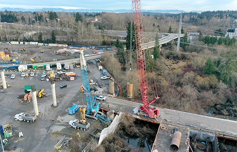 The project began construction about 18 months ago. During that time up to four drilling teams from Malcom Drilling worked long hours to complete the shafts, often close to active roadways and the I-5 freeway, or even drilling over water from a work trestle. Simultaneously, there have been other crews working on thousands of linear feet of retaining walls. GeoEngineers has provided full-time construction monitoring and guidance for the drilling, as well as the construction of thousands of linear feet of retaining walls along the route.