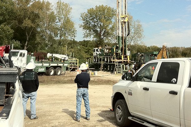 Layne Christensen, our drilling contractor, had commenced drilling operations earlier that afternoon and had progressed to a depth of approximately 20 feet by the time we arrived on site. Conductor pipe will be installed and cemented into the shallow bedrock, and then rotary drilling will continue to the top of the confining layer, anticipated at a depth of 2,850 feet. At that point, the drilling rig will be replaced by a coring rig, and coring will continue through the confining layer and target formation to the Pre-Cambrian surface, anticipated at a depth of 3,220 feet. The core from this borehole will also be transferred to McCracken Core Library, and samples of core will be provided to Missouri State University and Missouri University of Science & Technology for continuing research on this project.