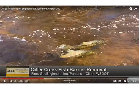 A small culvert beneath U.S. Route 101 near Shelton, Washington was obstructing flow and blocking critical fish species from accessing more than 13 miles of upstream spawning habitat in Coffee Creek. The Washington State Department of Transportation (WSDOT) hired GeoEngineers and partner firms to design and build a new sustainable stream alignment that would restore fish access while causing minimal disruption to traffic and adjacent ecosystems. GeoEngineers’ interdisciplinary design-build team avoided complications and saved WSDOT more than $3 million by recommending an alternative technical concept that rerouted Coffee Creek through a half mile of new stream alignment and restored fish access to upstream spawning and rearing habitat.