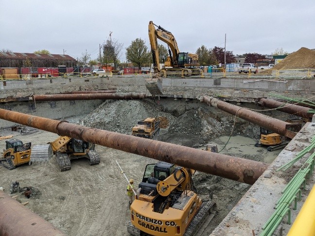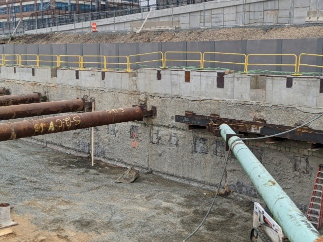 - Implemented a 30-inch-wide slurry wall system with one level of internal bracing; internal wales supported the long sides, and external wales reinforced the short sides and corners.
