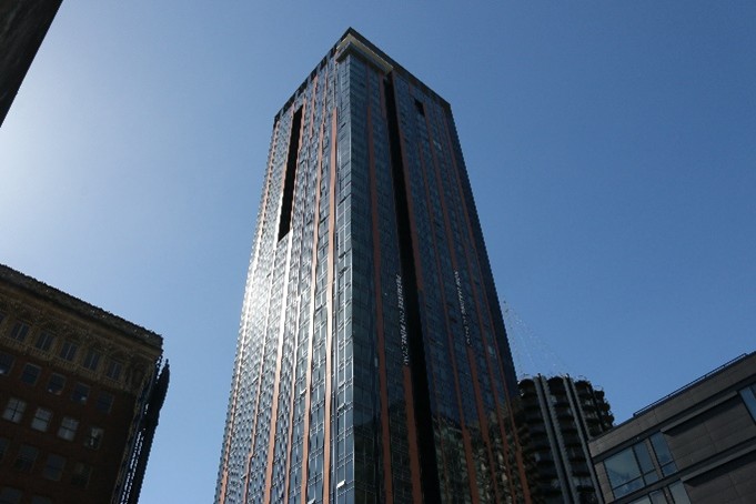 In 2011, Holland Construction began development of Premiere on Pine, a residential high-rise in downtown Seattle, Washington. The 440-foot tower boasts 40 floors of upscale apartments and is adjacent to the historic Paramount Theater on Pine Street. Holland hired GeoEngineers to provide geotechnical design and construction observation for excavation, shoring, and the building’s structural mat foundation.