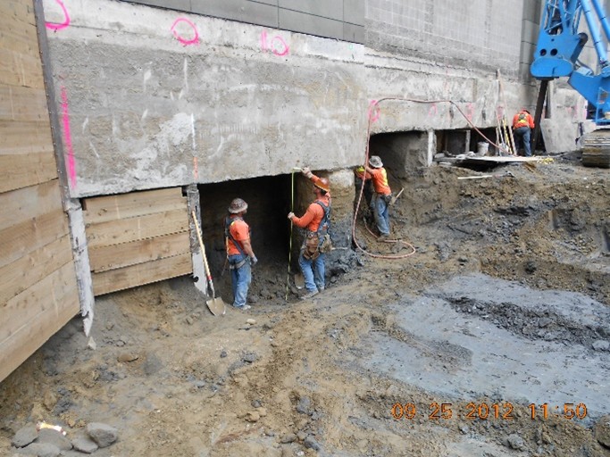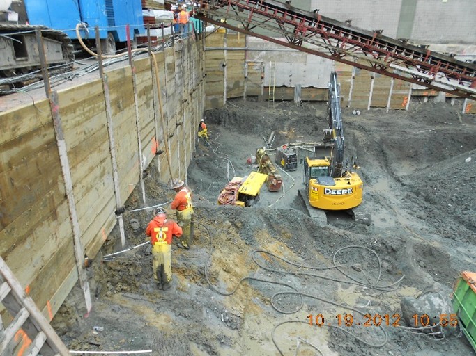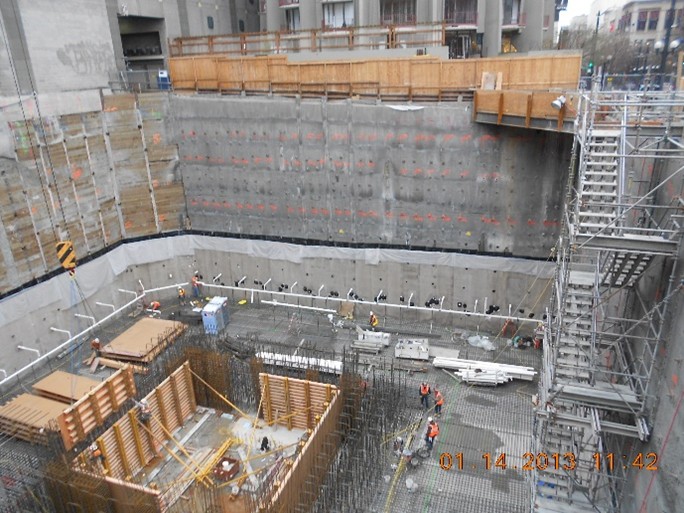 The excavation extended 65-70 feet below grade and excavation support was complex on three of the four sides of the excavation.  Two sides of the excavation had deep adjacent structures (the Pine Street light rail tunnel and the 801 Tower basement) offset from the shoring wall.  GeoEngineers designed a creative hybrid soldier pile/soil nail/tieback shoring system using numerical modeling to avoid a costly internally braced system on these two sides of the excavation.  The third side was located adjacent to the Seattle Convention Center which is supported on drilled shaft foundations that do not extend below the Premiere on Pine bottom of excavation elevation.  GeoEngineers collaborated with the structural engineer to design underpinning soldier piles located on either side of the drilled shaft foundations that transferred the drilled shaft loads to the soldier piles by means of a bridge pin assembly.