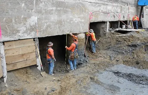 Underpinning soldier piles were installed on either side of the adjacent Seattle Convention Center’s drilled shaft foundations to transfer the drilled shaft loads to the soldier piles, given the excavation extended below the base of the drilled shafts.