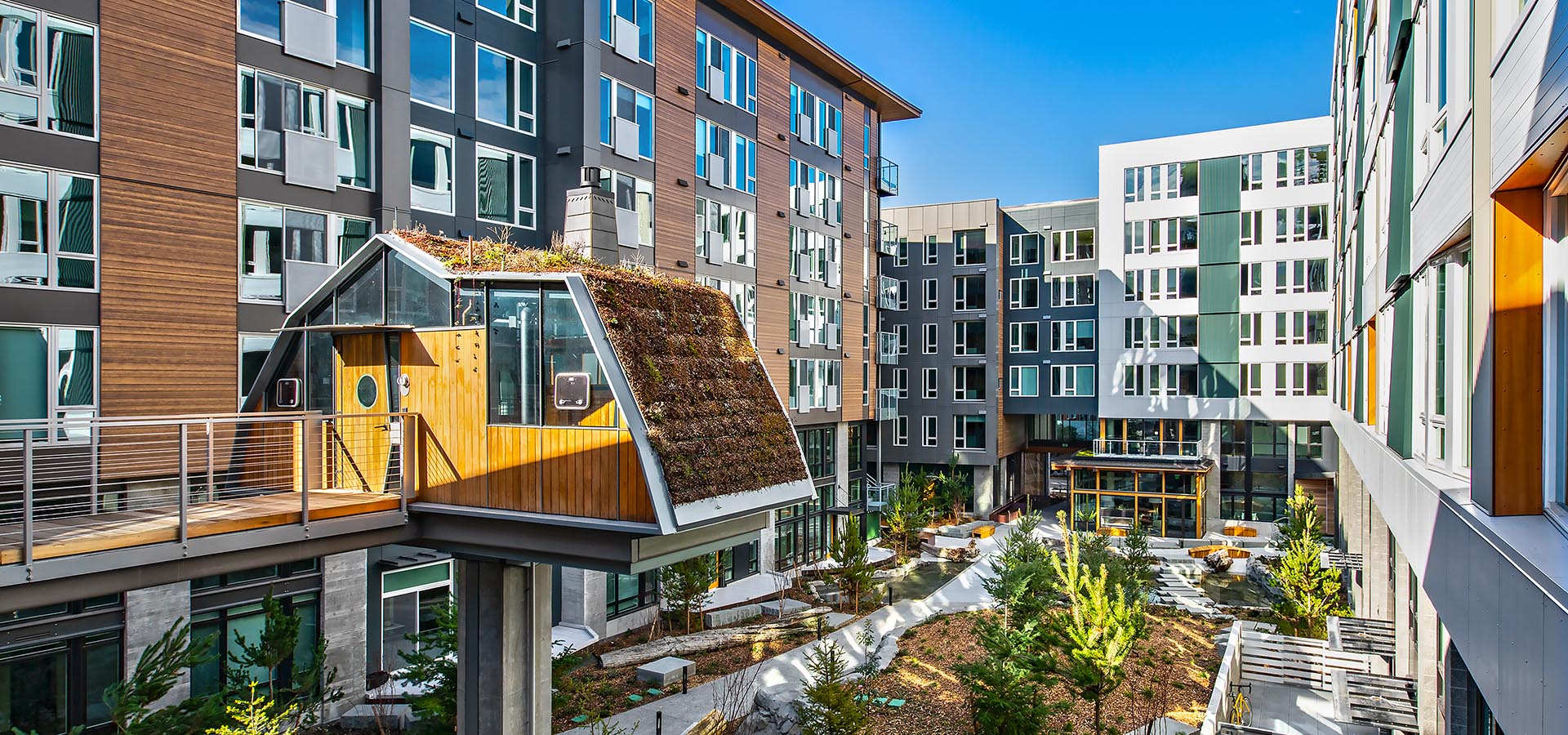 The apartment complex boasts green design features from Runberg Architecture Group including living roofs, an urban farm and an interior courtyard with a landscaped stream, pond and shared “treehouse” lounge for residents. (Copyright Michael Walmsley Photography)