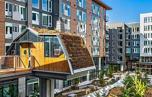 The project architect, Runberg Architecture Group, designed the complex from the ground up to be environmentally sustainable. Features like electric vehicle charging stations, living (vegetated) roofs, bike storage, an urban farm, wastewater recovery and gray water harvesting have earned the apartment complex a LEED for Home Platinum certification from Leadership in Energy and Environmental Design (LEED). An interior courtyard blends city living with green outdoor spaces complete with a landscaped stream, pond and shared “treehouse” lounge for residents.