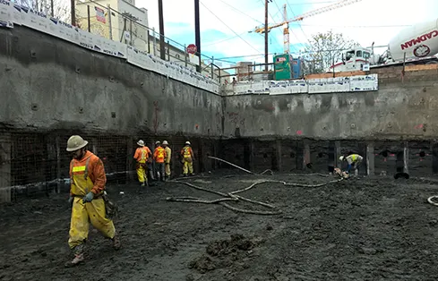 The team used a conventional soldier pile and tieback wall to support excavation on the north side of the site where a large-diameter storm sewer near the excavation required additional shoring support.